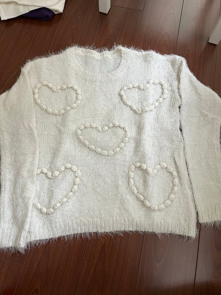 Uzun kollu, yuvarlak yakalı beyaz örgü kazak. Nakışlı kalp desenleriyle bohem tarzı, rahat ve yumuşak dokulu, günlük kullanıma uygun. Small ve medium bedene olur