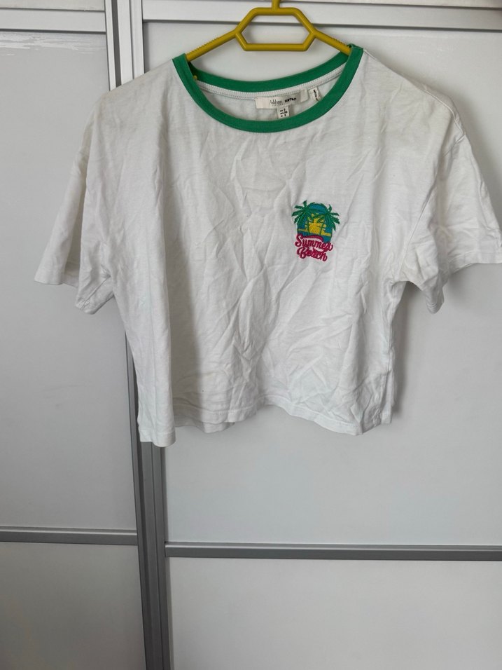 Beyaz pamuk kısa kollu crop tişört yesil yakalı kotonXaslıhanmalbora koleksiyonu