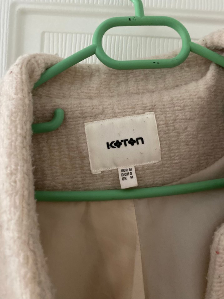 Koton markasına ait pamuk kumaşlı, örme dokulu beyaz kaşe ceket. Notlu yaka ve uzun kollu, normal midi boyunda, günlük kullanıma uygundur.