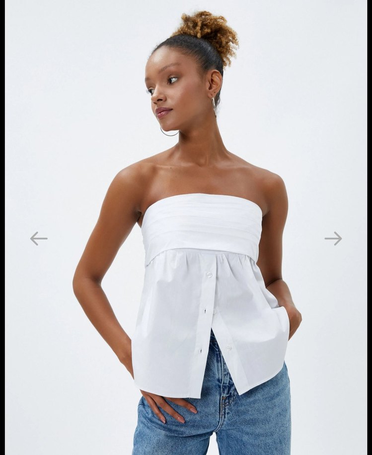 Yumuşak pamuktan, beyaz straplez mini bluz. Salaş kesimi ve kolsuz tasarımıyla rahat ve şık bir günlük seçenek. ic etiketi kesik fiyata yansıtılmıştır