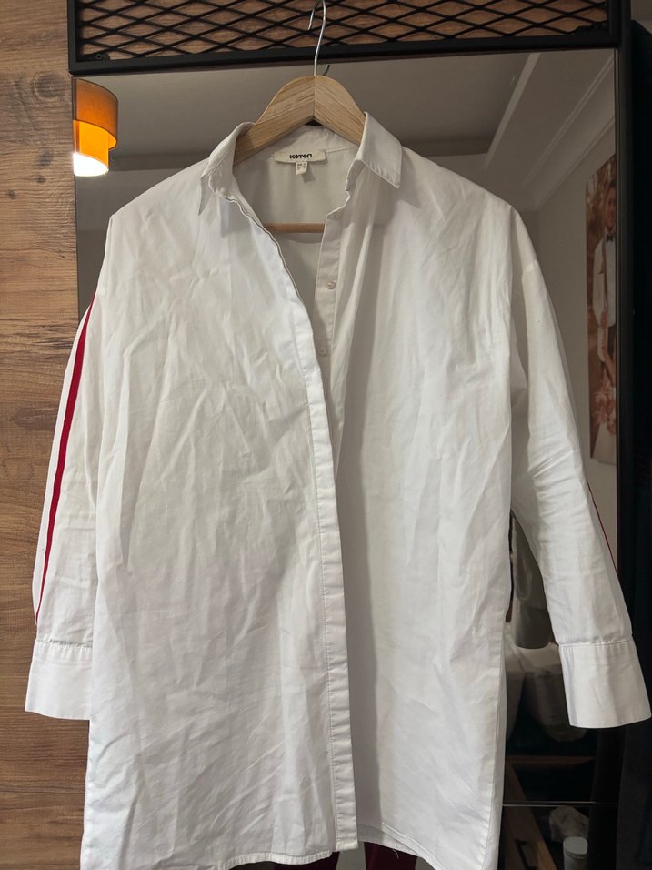 Beyaz pamuklu gömlek, uzun kollu ve düğmeli manşetlere sahiptir. Yaka tipi yakalı ve bol kesimdir. Kollarında ince kırmızı şeritler bulunan minimalist tasarım, günlük sokak stili için uygundur. Hasarı yok boyu 75cm