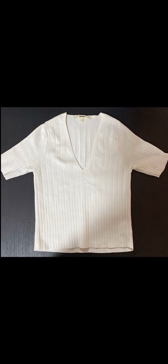 V yaka, uzun kollu, beyaz pamuklu, örme dokulu, sade ve normcore tarzında, günlük kullanıma uygun kadın croptop.
