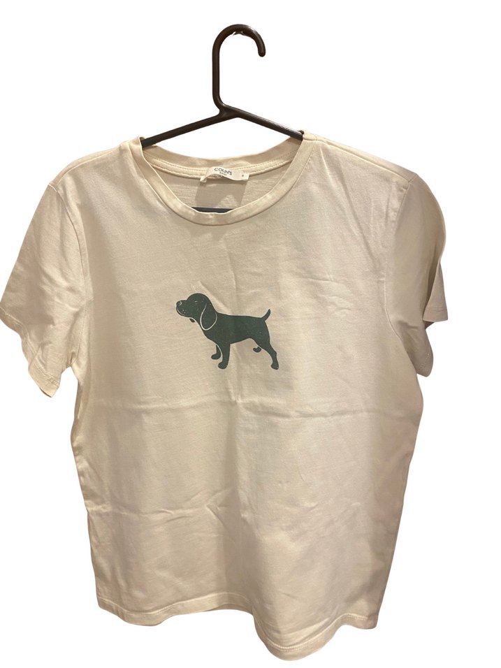 Kısa kollu, bisiklet yaka beyaz pamuklu tişört, minimal köpek baskılı. Rahat ve günlük kullanıma uygun, bol kesim.