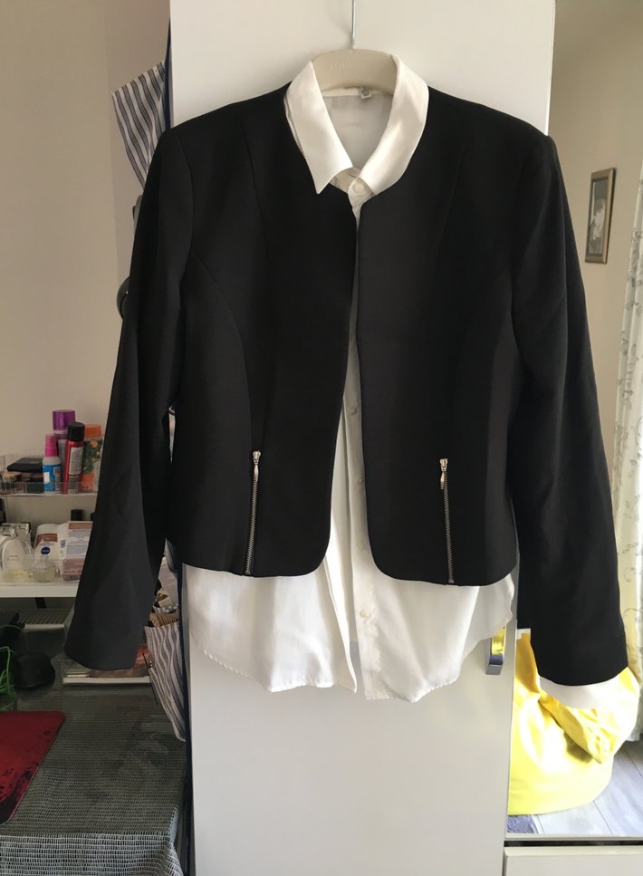 Kadın siyah ceket, normal kesim, uzun kollu ve fermuarlı ceplerle. Notlu yaka ve midi boy, ofis için uygun. Sentetik kumaştan, desensiz tasarım. 42 beden tam kalıp
