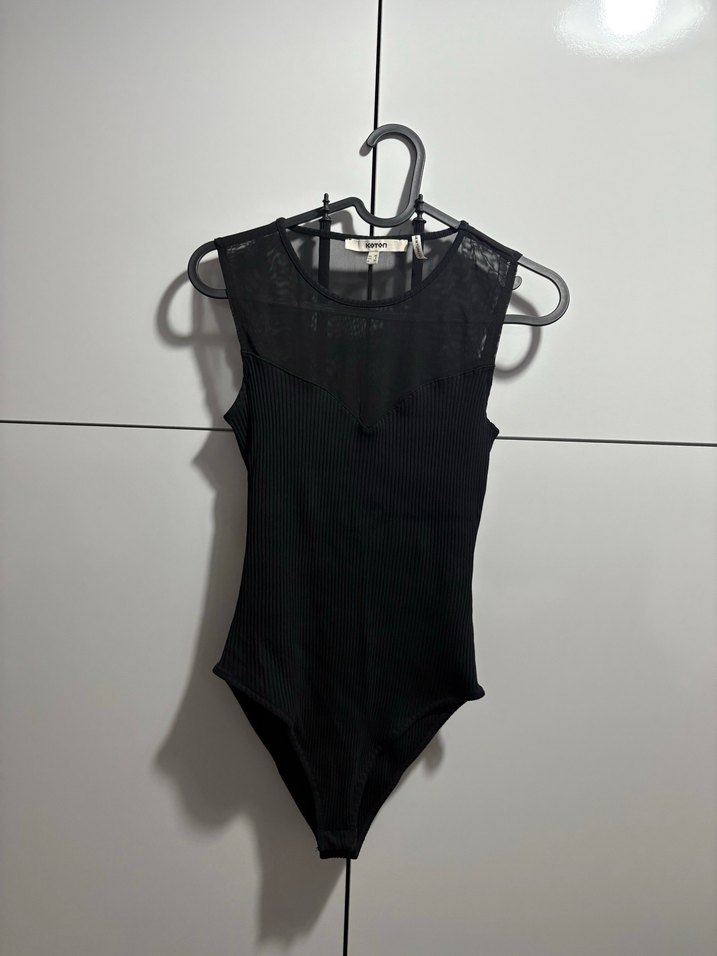 Kolsuz, vücuda oturan siyah bodysuit, şeffaf üst panel ve midi uzunlukta. Cesur, gotik tarz için uygun, günlük kullanıma uygun.
