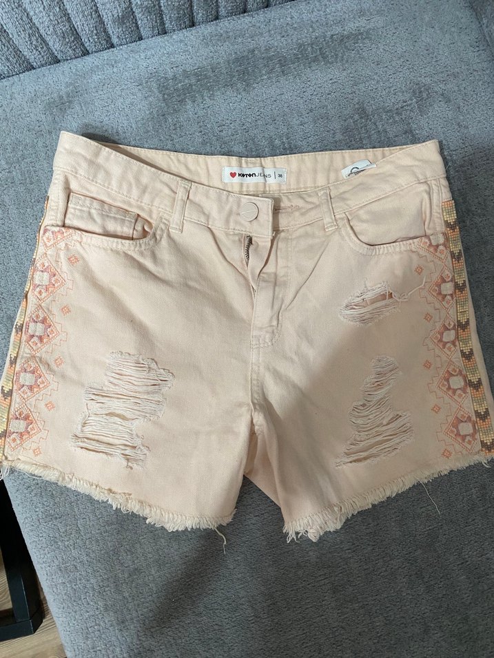 Koton Bohem Nakışlı Bej Mini Denim Şort