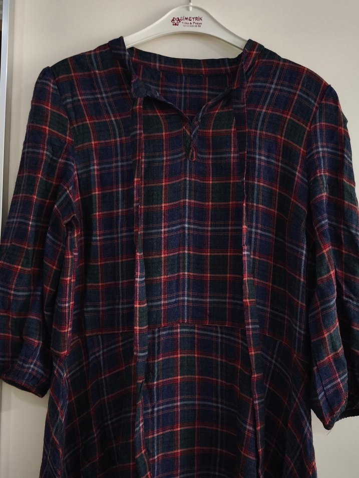 Bol kesim, koyu renkli kareli desenli hamile tunik. Yaka ve düğmeli ön kısmı, uzun kollu ve midi boy. Rahat sentetik kumaştan, bohem tarzda.