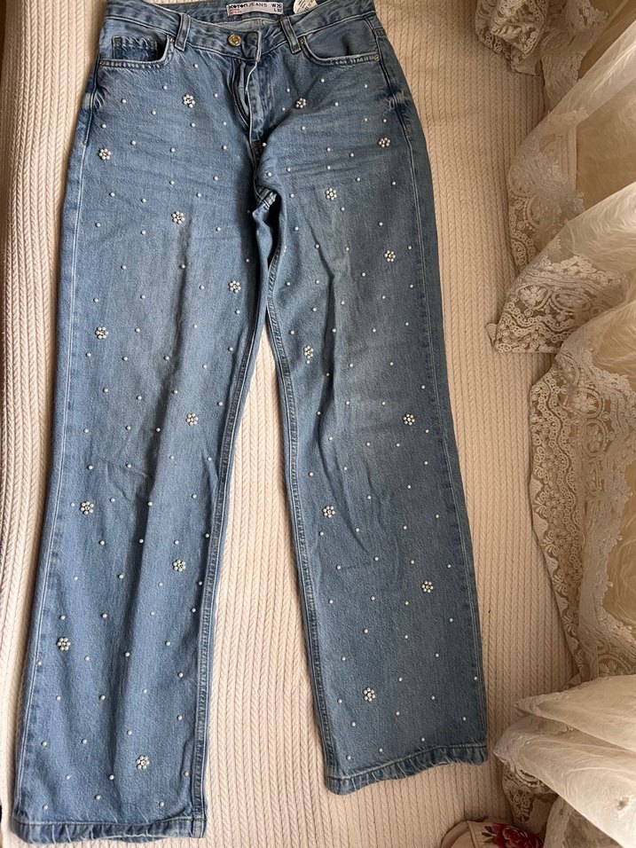 Düğmeli ve nakışlı çiçek desenli, mavi-gri tonlarda, bol kesim kot pantolon. Midi boy, gündelik sokak tarzına uygun. Denemeden aldım bu yaz sayılı giydim çok dar geldi etiketi yok yepyenidir giymediğim için katladım kaldırdım o yüzden kırışık