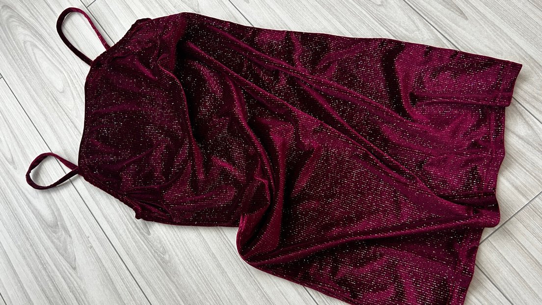 Bordo renk, yumuşak sentetik kumaştan kadın elbisesi, parlak yüzey ile göz alıcı bir görünüm sunar. ✨