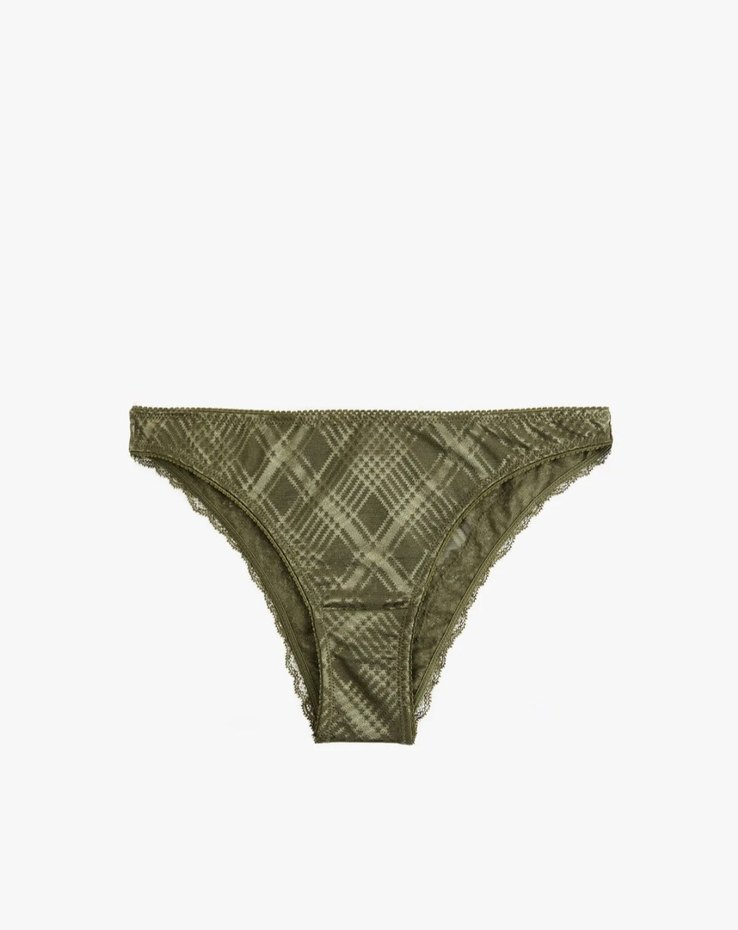Haki s beden kadın iç çamaşırı, ekose desenli dokusu ve ince dantel detaylarıyla. Rahat ve sade tasarım.