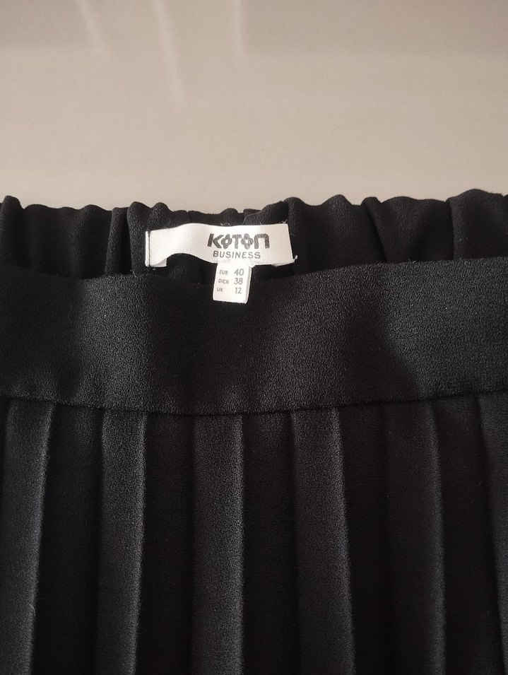 Koton Business siyah pileli midi hamile eteği, sentetik kumaştan ve bol kesimlidir. Ofis kullanımı için uygundur ve trendsetter tarzına hitap eder.
