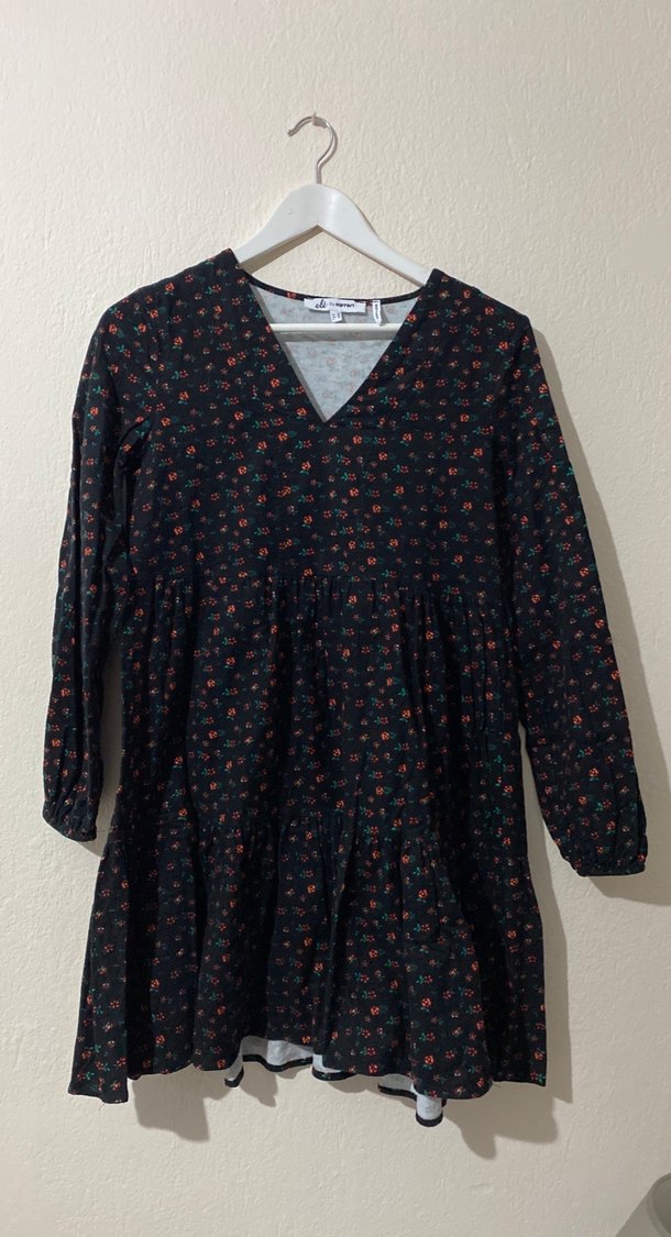 Bohem tarzda, V yaka ve uzun kollu, bol kesim midi elbise. Koyu renkli çoklu çiçek desenli ve fırfırlı, yumuşak sentetik kumaştan yapılmıştır.