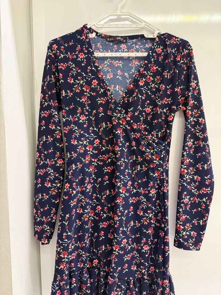 V yaka ve uzun kollu, çiçek desenli koyu renkli mini elbise.bohem tarzda, yumuşak sentetik kumaştan yapılmıştır.