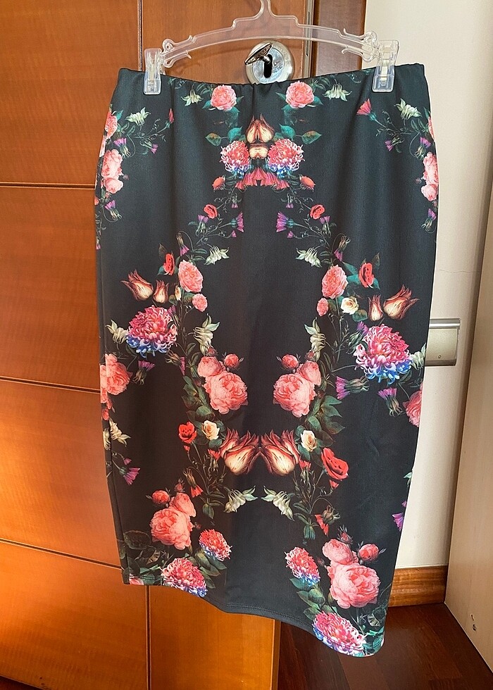 koyu yeşil satensi örme kumaş üzerine çiçek desenli, boyu 65 cm, beli lastikli, giyilmedi, sorunu yoktur