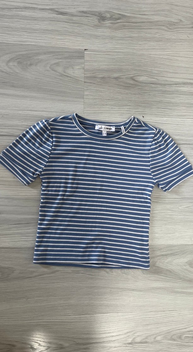 Mavi ve gri çizgili, kısa kollu, bisiklet yaka ve dar kesim kadın tişörtü. Denim kumaştan, günlük kullanıma uygun sokak stili tişört.urun kullanilmistir defosu yoktur