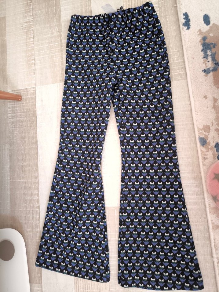 Kadınlar için pilili ve ispanyol paça kesim, koyu mavi batik desenli rahat ve retro tarzda tekstil pantolon. Günlük kullanım için uygundur.