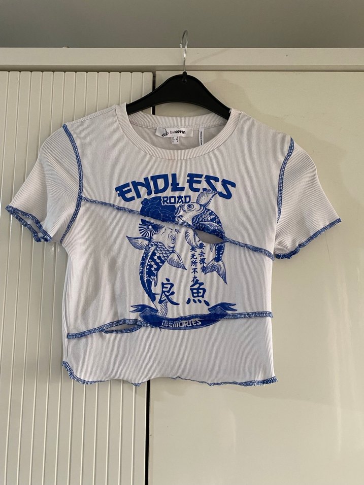 Kısa kollu, bisiklet yaka ve kemer detaylı mavi baskılı denim tişört. Günlük rahat sokak stiline uygun, fitted kesim ve normal midi boyda.