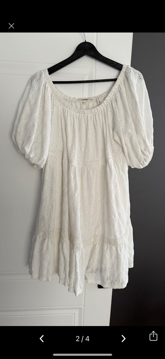 Kısa balon kollu, tekne yaka beyaz bohem midi elbise. Pamuk kumaştan, dantel işlemeli ve bol kesimdir. Romantik akşamlar için uygundur.