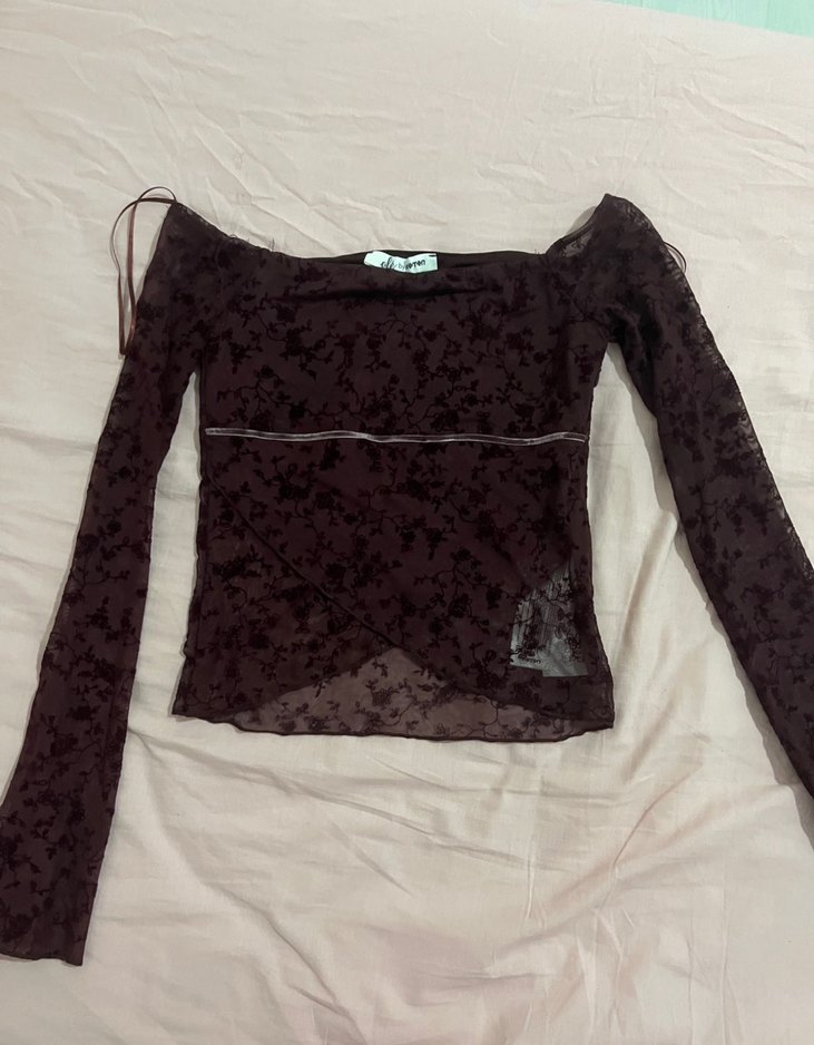 Dantel detaylı, straplez yaka ve uzun kollu bordo gotik bluz