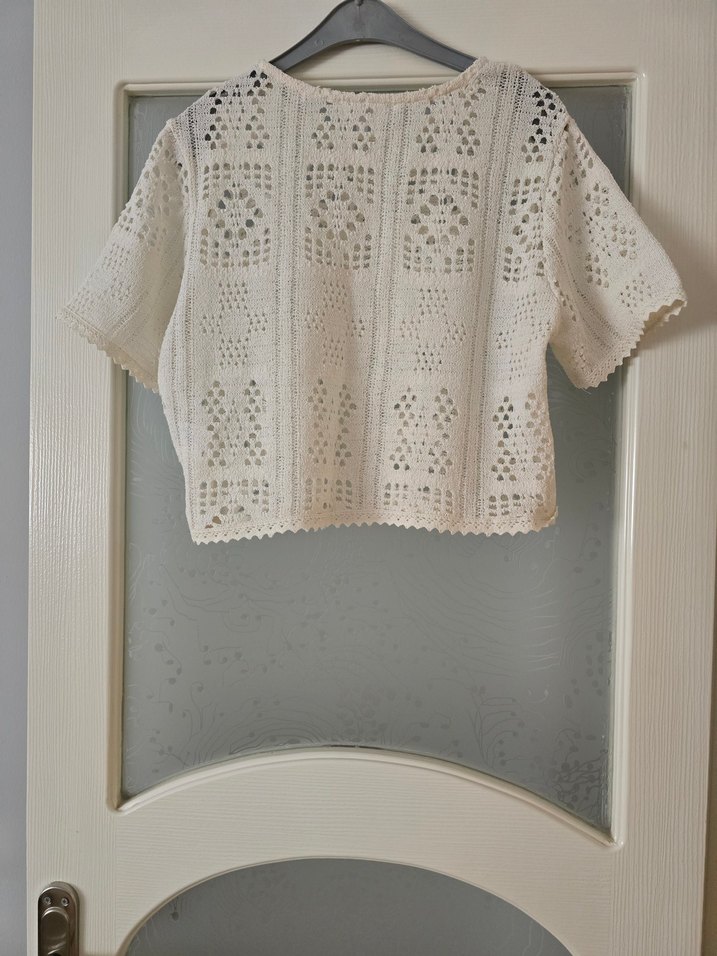 Dantel işlemeli, kısa kollu, yuvarlak yakalı ekru örme bluz. Rahat kesimi ve bohem tarzıyla günlük kullanıma uygun.