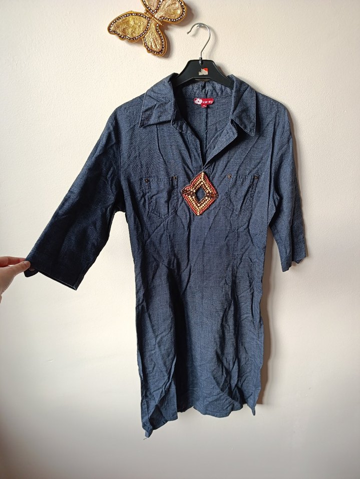 koton koyu denim gömlek elbise bohem vintage tarz s beden uyumlu iki koltukaltı arası 44 boy 90 cm #vintage #bohem #2000s