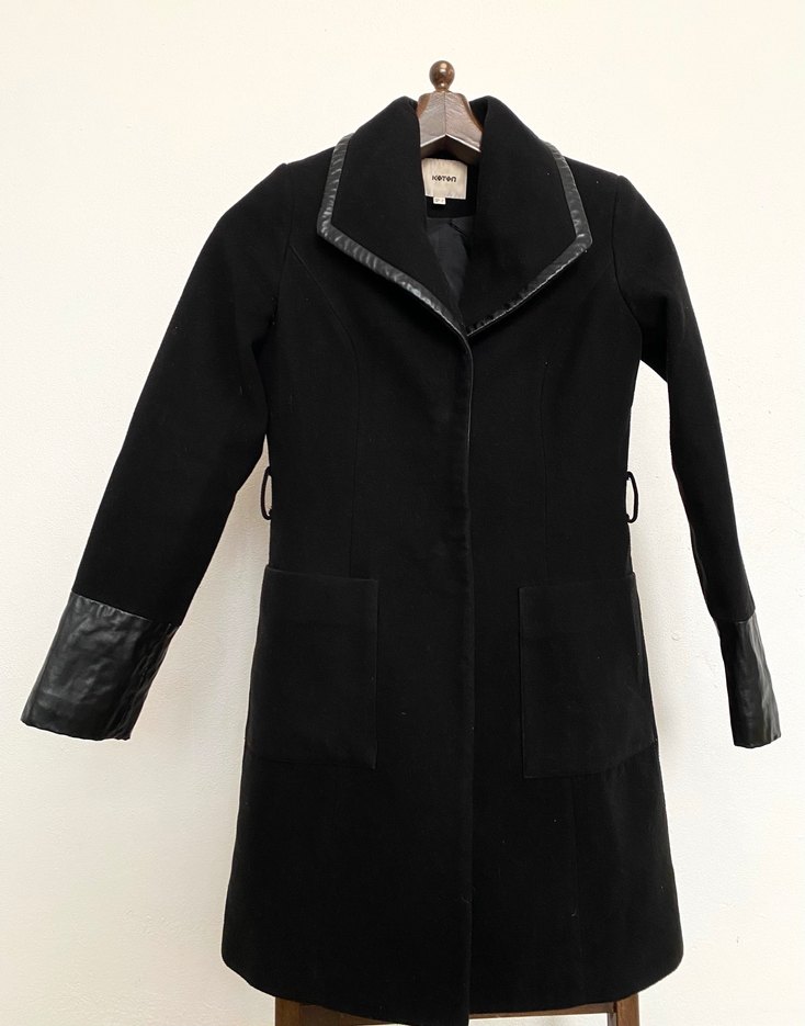 Yaka ve kol manşetlerinde deri detayları bulunan siyah kaban. Uzun kollu ve sade tasarımlı. Kemeri olmadığı için fiyatı çok uygun tuttum. Başka bir kemer ile kombinleyebilirsiniz.☺️