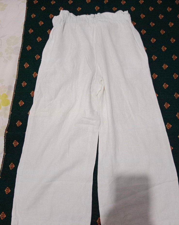 Düğmeli, bol kesim beyaz keten pantolon. Uzun boy ve gündelik sokak stili için uygundur.