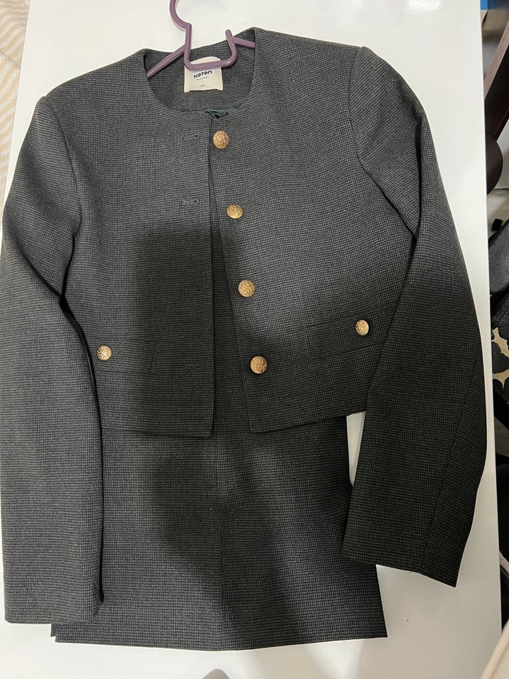 Düğmeli ceket, yaka detaylı ve uzun kollu gri kadın takımı. Sentetik kumaştan, normal kesim ve midi boyda, iş ortamı için uygun. Yeni , hiç kullanılmadı.