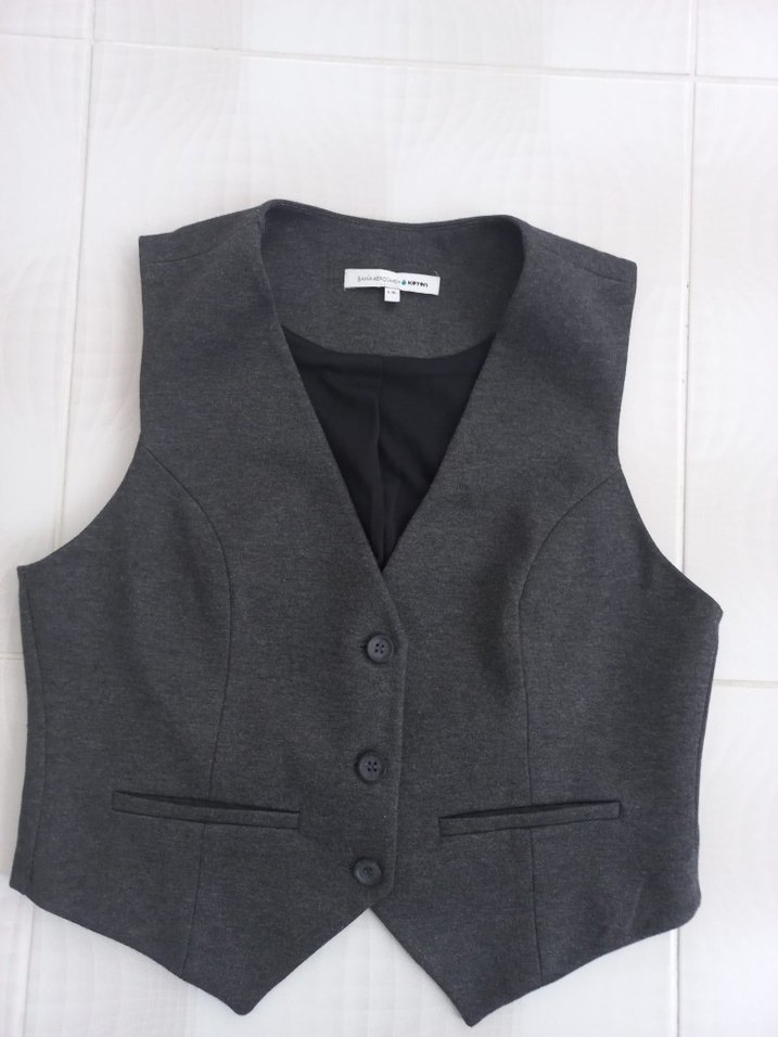 Düğmeli, yakalı, kolsuz gri kadın yelek. Sentetik kumaştan, normal kesim ve midi boyda, ofis için uygun.