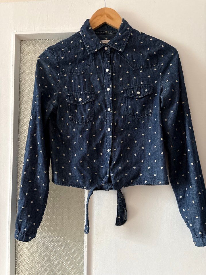 Düğmeli ve yakalı bu mavi denim kadın gömlek, uzun kollu ve baskılı desene sahip. Altında bağlama detayı bulunur.