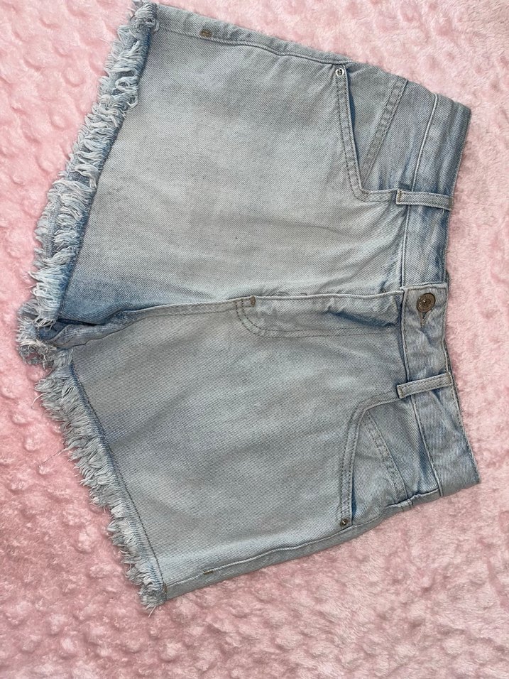 Düğmeli, püsküllü kenarları ve hafif bağlamalı desenli mavi kot şort, rahat ve salaş kesimle günlük sokak stiline uygun.
