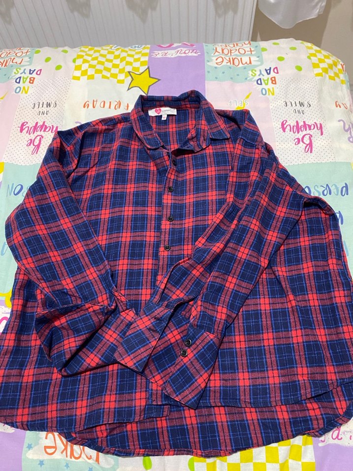 Renkli pamuklu gömlek, düğmeli ön, uzun kollu ve yakalıdır. Salaş kesim ve normal boyda, günlük kullanıma uygundur.