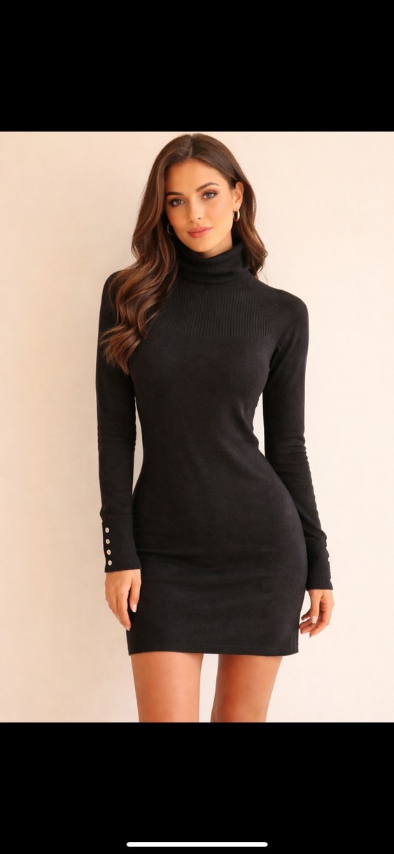 Düğmeli manşet detaylı, yüksek yakalı, siyah süet kumaştan yapılmış, vücuda oturan triko elbise. Midi boyu ve uzun kollarıyla romantik akşamlar için uygun şık bir seçim. Etek boyu bu kadar kısa olmayabilir ölçmemi isterseniz ölçebilirim