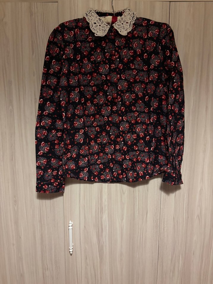 Uzun kollu, dantelli yakalı ve düğmeli önlü, koyu renk çiçek desenli bol kesim kadın gömlek. Sokak stili için uygun.