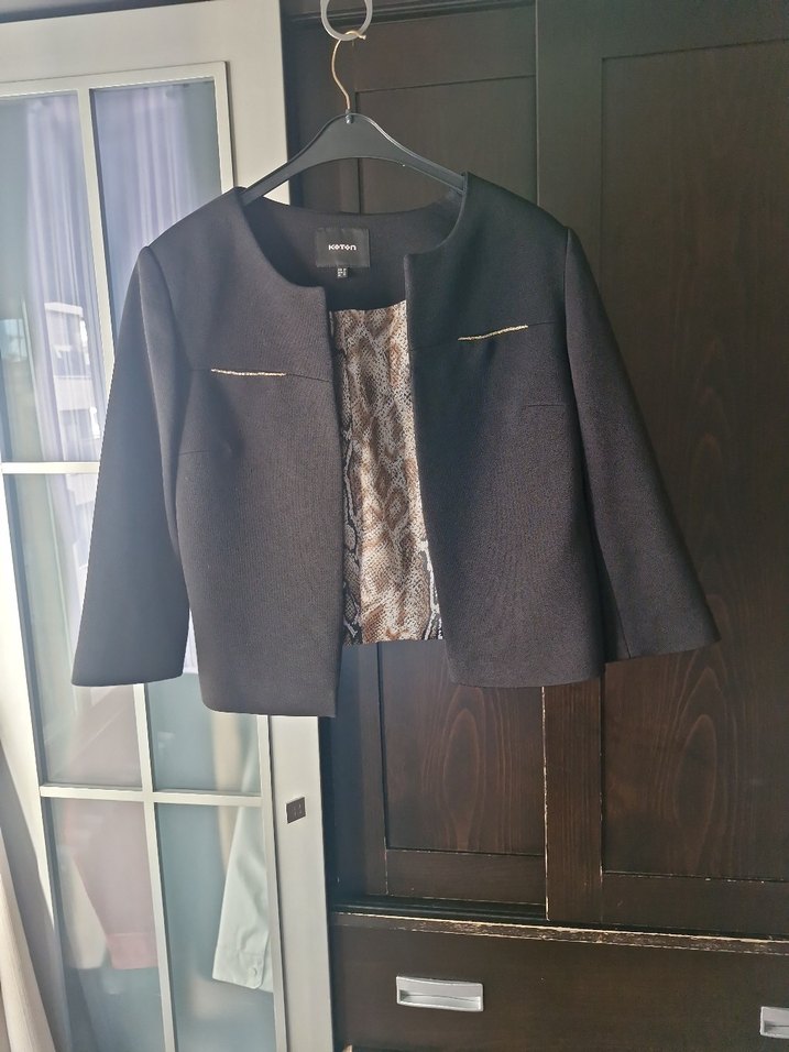 Koton marka, içi yılan desenli astarlı, Siyah, M beden, 3/2 uzunlukta kollu, cok az giyilmiş, defosuz tertemiz ceket. Spor, şık, ofis için uygun.