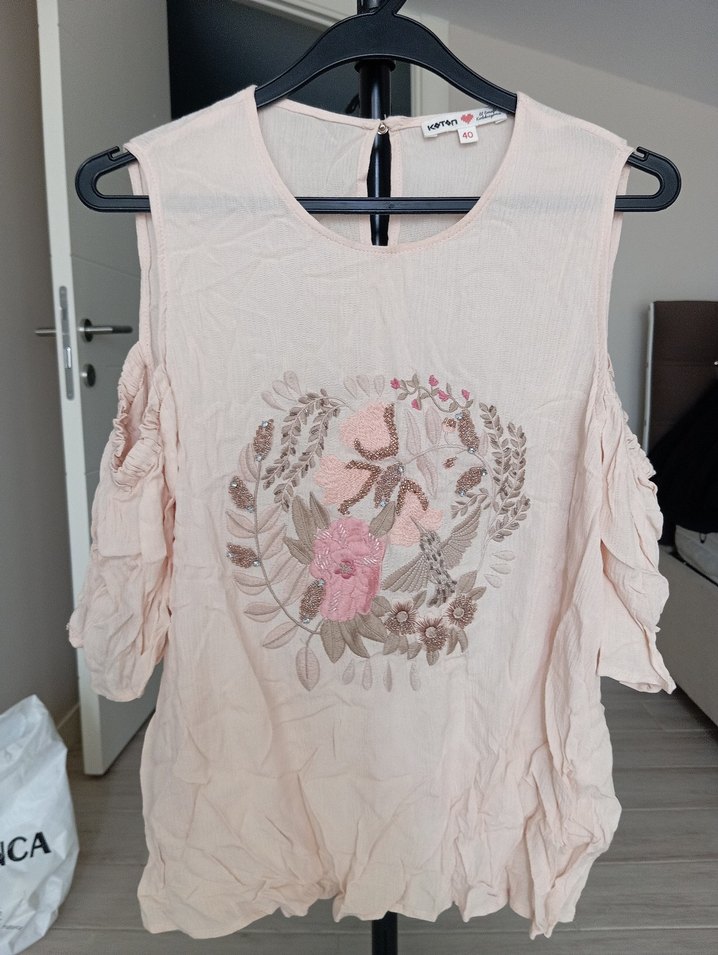 Pembe renkli, kısa kollu, çiçek nakışlı ve fırfır detaylı bol kesim bohem tarzı bluz. Koltuk altı ölçüsü 80 Boy 60 cm dir.