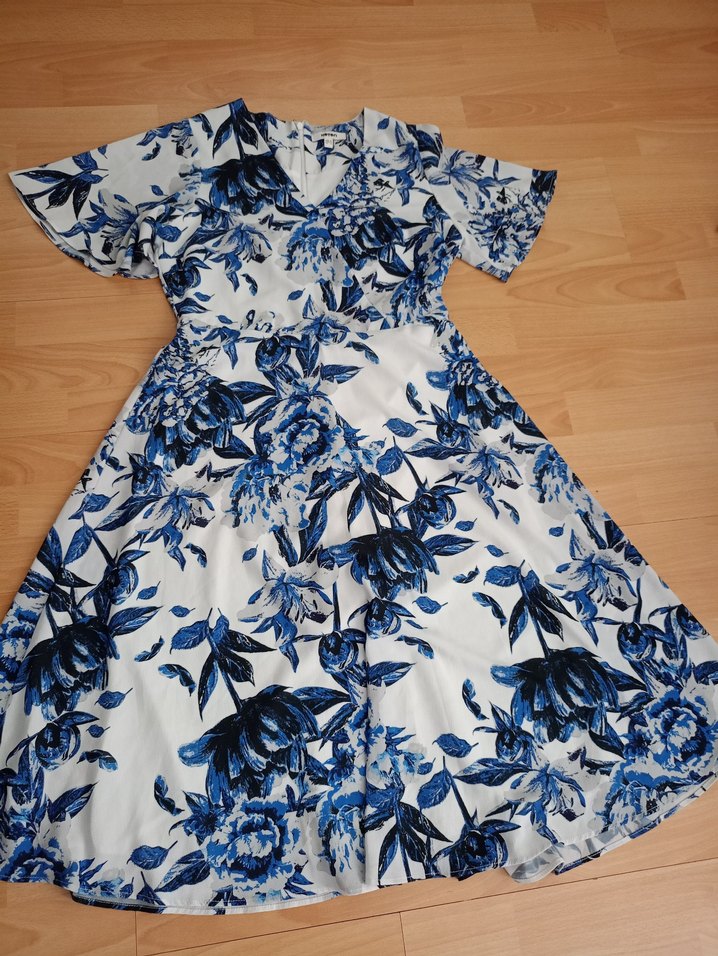 Mavi baskılı, kısa kollu, V yakalı, bol kesim. Yumuşak sentetik kumaştan, drapeli ve bohem tarzda.bel 38 cm boy 108 cm iki koltuk arası 47 cm