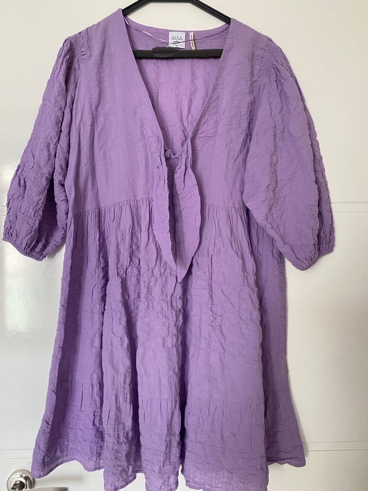 Lila pastel renginde, yumuşak keten kumaştan yapılmış bol kesim . V yaka, kısa kollu ve drapeli tasarıma sahip, bohem tarzına uygun. Arka kısmında çok küçük bi beyazlık var fotoğraflarda ekledim