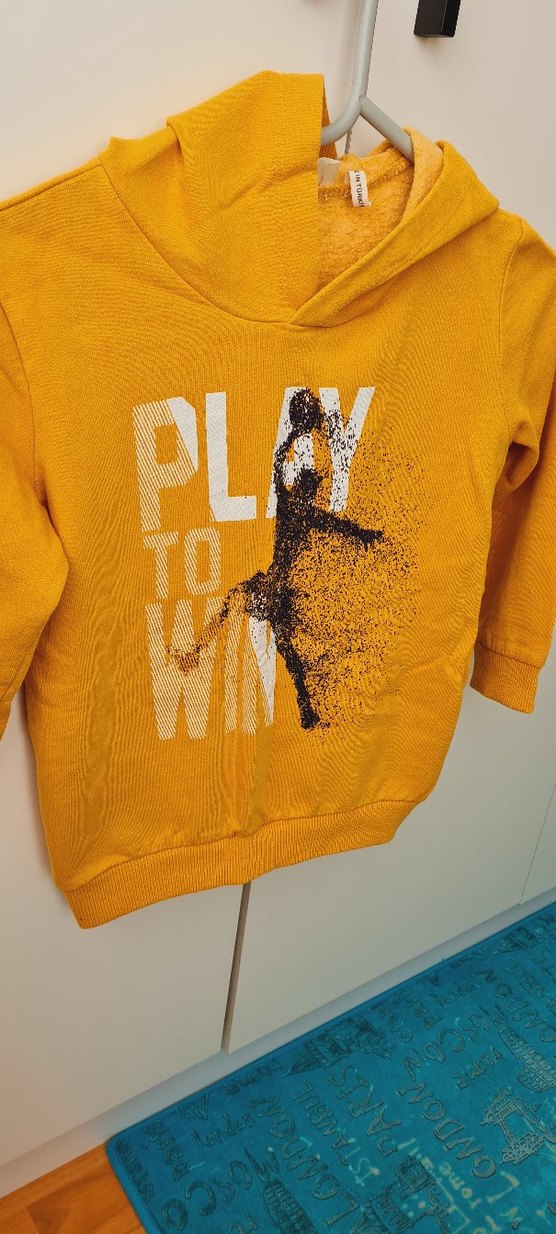 Erkek çocuklar için bol kesim, uzun kollu, yuvarlak yakalı, yumuşak ve sıcak kumaştan yapılmış canlı sarı renkli sweatshirt. Renkli baskı ve fermuar detaylıdır. Yepyeni sayilir oglum bir kac kez giydi küçüldü.. Sicacik tutuyor..
