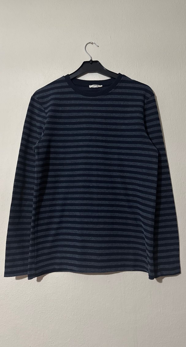 Lacivert ve gri çizgili, uzun kollu erkek sweatshirtü. Normal kesim ve yuvarlak yaka ile günlük kullanıma uygun. Kusursuz ve defosuz L beden fakat etikette yazmıyor.