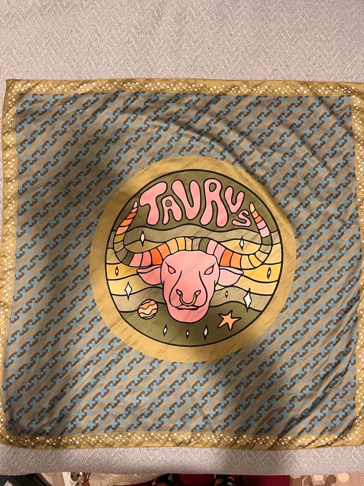 Koyu altın renginde, bohem ve grunge punk tarzında Boğa burcu eşarbı. Pembe boğa figürü ve sanatsal detaylar içerir.
