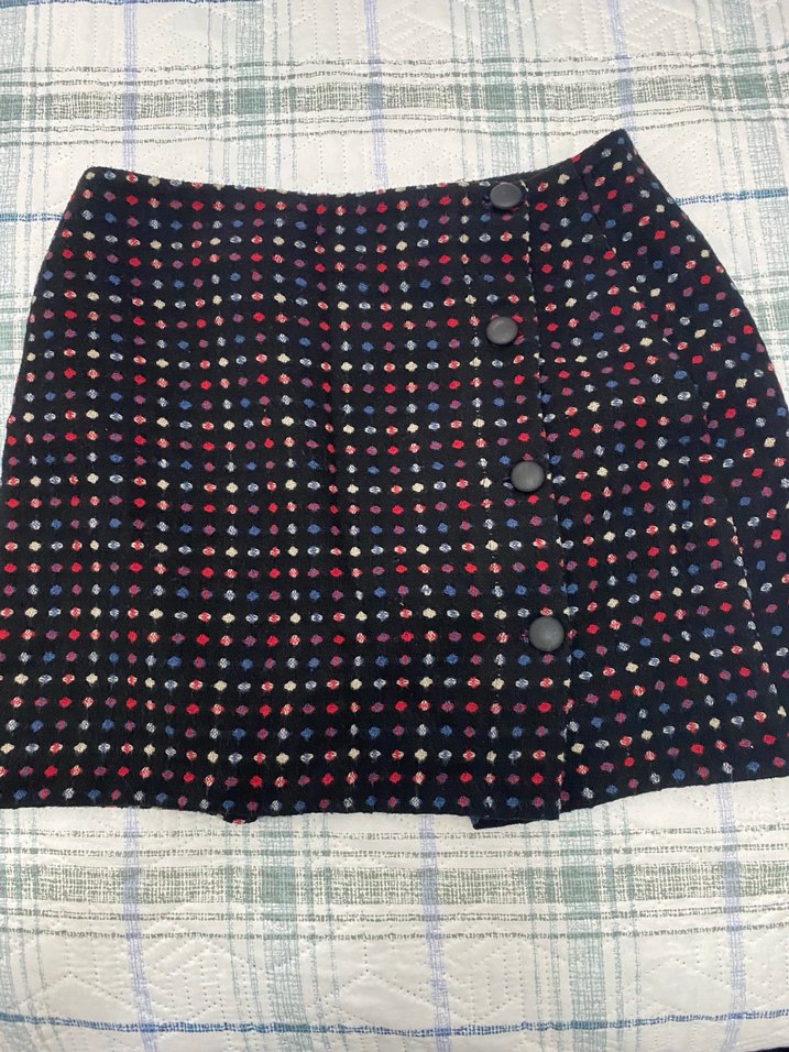 Bu dar kesim mini etek, çok renkli puanlı desenli koyu renkli tekstil kumaştan yapılmıştır ve yan tarafında düğme detayları vardır. Paris tarzında günlük sokak giyimi için uygundur.