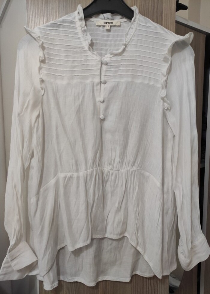 2-3 defa kullanıldı.Yaka kısmında fotoğraftaki gibi dikkatli bakmayınca belli olmayan bir defosu var.Ön boy:54 cm Arka boy:66 cm .Kırık beyaz