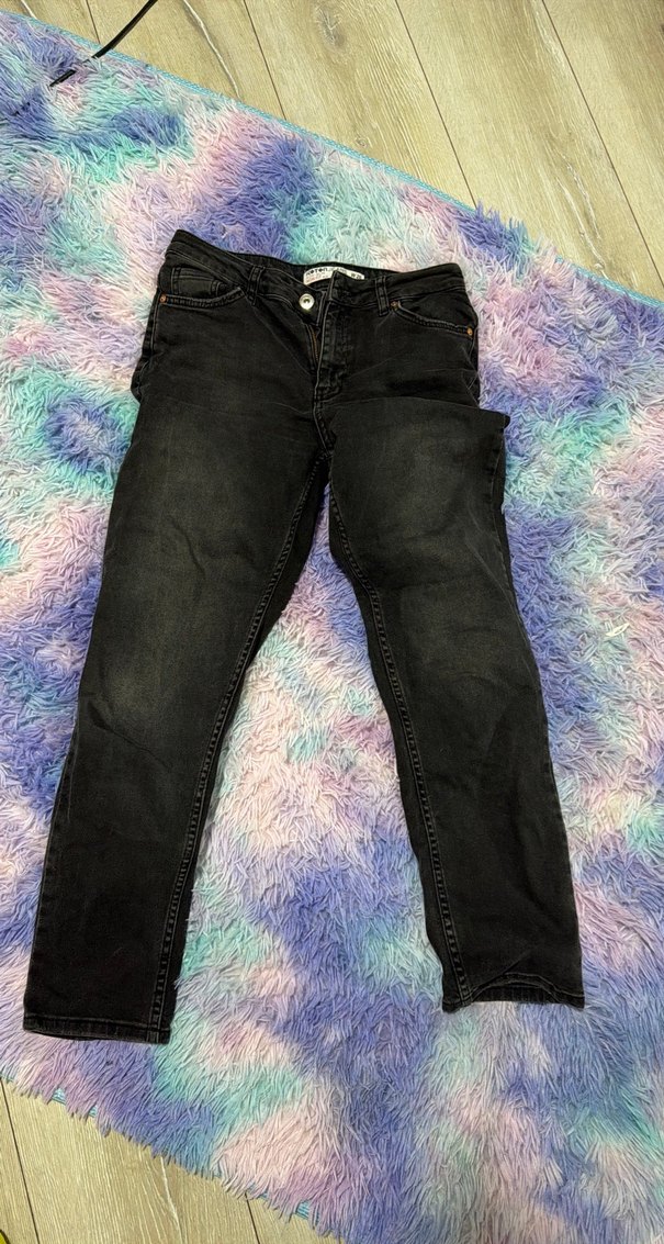 Mom fit s/M uyumlu Gri renkte, bağcıklı detaylı, salaş kesim kot pantolon. Normal boyda ve koyu renk tonlarında batik desenli, günlük kullanıma uygun.