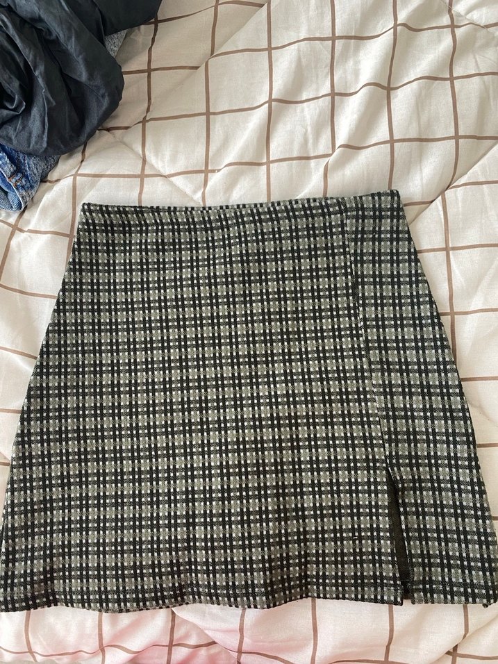 Gri ekose desenli, pilili ve sentetik kumaştan yapılmış, fitted kesim mini etek. Günlük kullanım için Paris sokak modası tarzında.