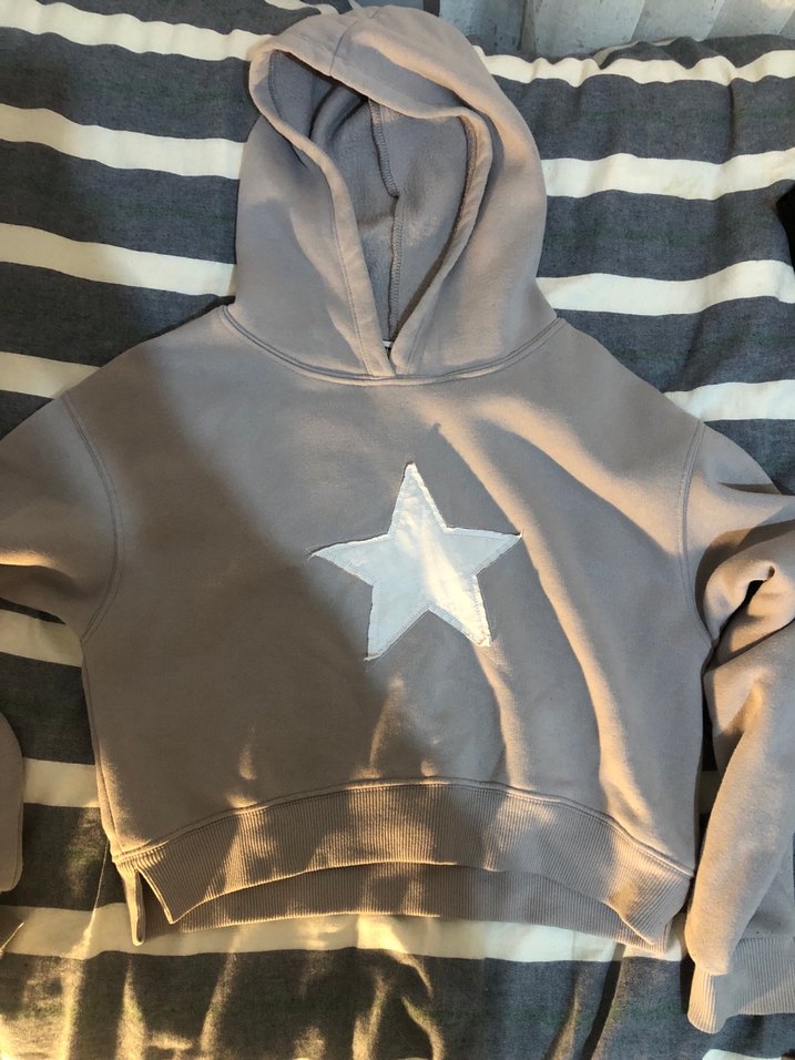 Uzun kollu, kapüşonlu ve gri renkte, yumuşak ve sıcak kumaştan yapılmış, önünde sade bir yıldız deseni bulunan, kısa crop boyda, vücuda oturan kadın sweatshirtü. Günlük kullanıma uygun, zahmetsiz şıklık sunar. ⭐