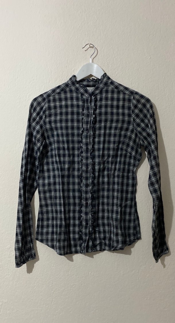Gri kareli, keten kumaştan üretilmiş, uzun kollu, yakalı ve düğmeli ön kısmı olan, rahat kesime sahip kadın gömlek.