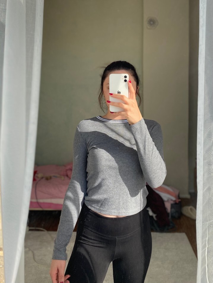 Yumuşak fleece kumaştan, yüksek yakalı ve uzun kollu, fitted kesim gri crop top. Günlük kullanım için şık ve rahat bir görünüm sunar. Herhangi bir deformesi yok birkaç kez giyildi