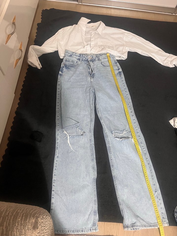 Salaş kesim mavi kot pantolon, yırtık ve slit detaylıdır. Midi boyda, günlük rahat sokak stili için uygundur. Rahat ve trend bir tasarım. 30/32 gömlek koton 38 beden kombin fiyatı 1500 tl