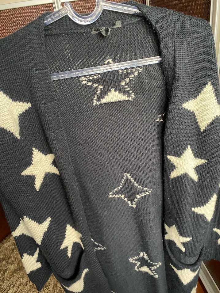 Gri renkli, nakışlı yıldız desenli triko hırka. Notched lapel yakalı, uzun kollu, midi boy ve bol kesimdir. Bohem tarzda rahat bir modeldir. ✨